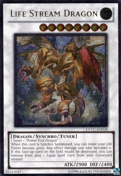 1 Tuner + ‘Power Tool Dragon’When this card is Synchro Summoned: You can make your LP become 4000. You take no effect damage. If this face-up card on the field would be destroyed, you can banish 1 Equip Spell Card from your Graveyard instead.