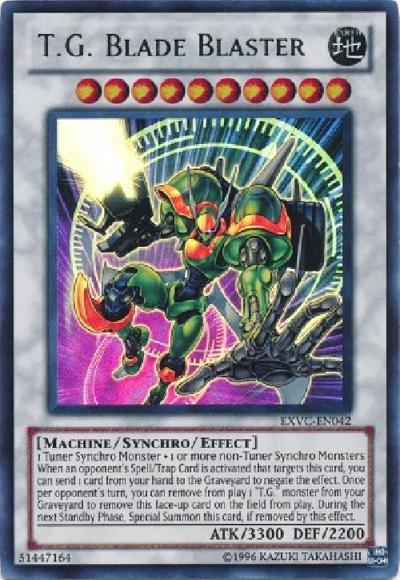 1 Tuner Synchro Monster + 1 or more non-Tuner Synchro MonstersDuring either player’s turn, when your opponent activates a Spell/Trap Card that targets this face-up card: You can send 1 card from your hand to the Graveyard; negate the effect. Once per turn, during your opponent’s turn: You can banish 1 ‘T.G.’ monster from your Graveyard; banish this face-up card on the field (this is a Quick Effect). During the next Standby Phase after this card was banished by this effect: Special Summon this card.