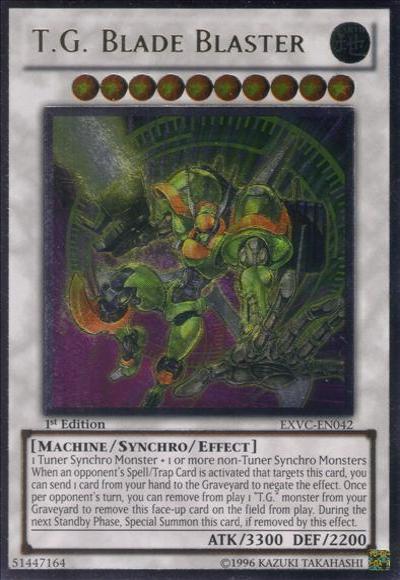 1 Tuner Synchro Monster + 1 or more non-Tuner Synchro MonstersDuring either player’s turn, when your opponent activates a Spell/Trap Card that targets this face-up card: You can send 1 card from your hand to the Graveyard; negate the effect. Once per turn, during your opponent’s turn: You can banish 1 ‘T.G.’ monster from your Graveyard; banish this face-up card on the field (this is a Quick Effect). During the next Standby Phase after this card was banished by this effect: Special Summon this card.