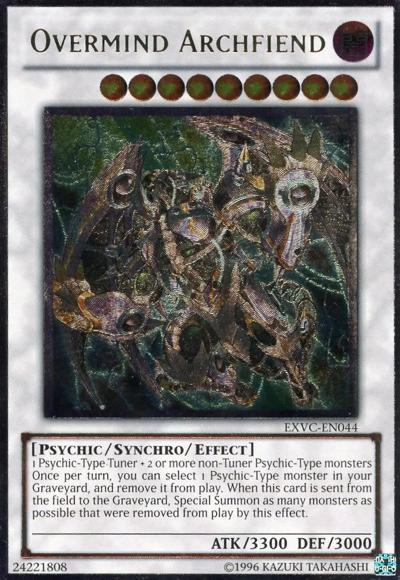 1 Psychic-Type Tuner + 2 or more non-Tuner Psychic-Type monstersOnce per turn, you can select 1 Psychic-Type monster in your Graveyard, and remove it from play. When this card is sent from the field to the Graveyard, Special Summon as many monsters as possible that were removed from play by this effect.