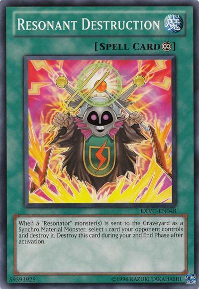 Each time a ‘Resonator’ monster(s) is sent to the Graveyard as a Synchro Material: Target 1 card your opponent controls; destroy that target. Destroy this card during your 2nd End Phase after activation.