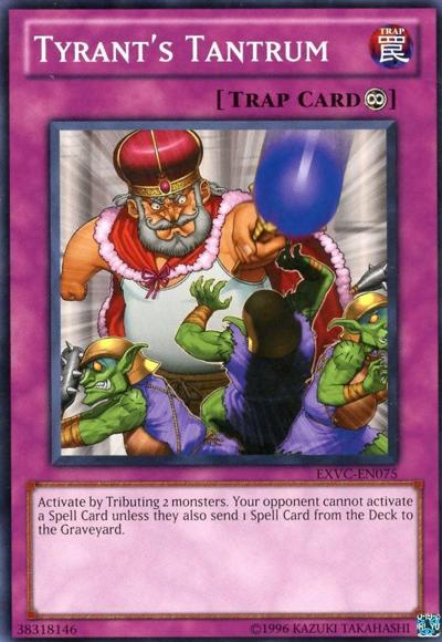 Activate by Tributing 2 monsters. Your opponent cannot activate a Spell Card unless they also send 1 Spell Card from the Deck to the Graveyard.