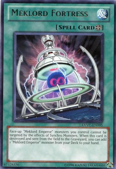 ‘Meklord Emperor’ monsters you control cannot be targeted by the effects of Synchro Monsters. When this card on the field is destroyed and sent to the Graveyard: You can add 1 ‘Meklord Emperor’ monster from your Deck to your hand.