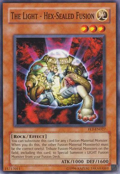 You can substitute this card for any 1 Fusion Material Monster, but the other Fusion Material Monster(s) must be correct. You can Tribute Fusion Material Monsters on the field, including this face-up card; Special Summon 1 corresponding LIGHT Fusion Monster from your Extra Deck.