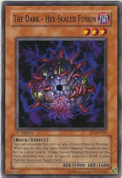 You can substitute this card for any 1 Fusion Material Monster, but the other Fusion Material Monster(s) must be correct. You can Tribute Fusion Material Monsters on the field, including this face-up card; Special Summon 1 corresponding DARK Fusion Monster from your Extra Deck.