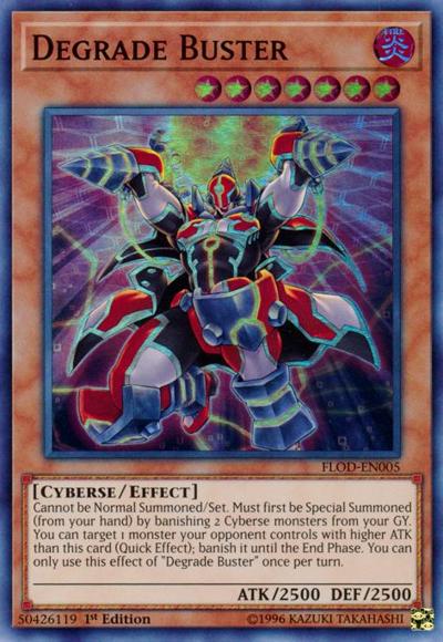 Cannot be Normal Summoned/Set. Must first be Special Summoned (from your hand) by banishing 2 Cyberse monsters from your GY. You can target 1 monster your opponent controls with higher ATK than this card (Quick Effect); banish it until the End Phase. You can only use this effect of ‘Degrade Buster’ once per turn.