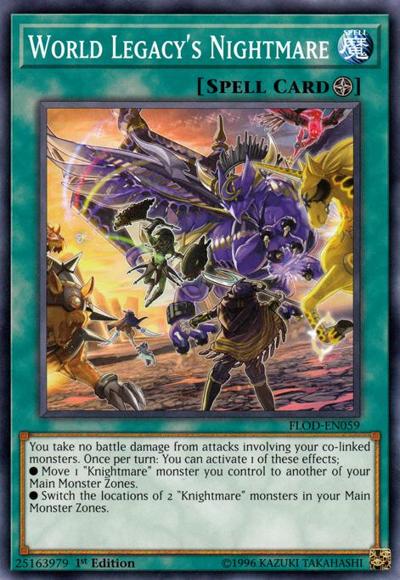 You take no battle damage from attacks involving your co-linked monsters. Once per turn: You can activate 1 of these effects;● Move 1 ‘Knightmare’ monster you control to another of your Main Monster Zones.● Switch the locations of 2 ‘Knightmare’ monsters in your Main Monster Zones.