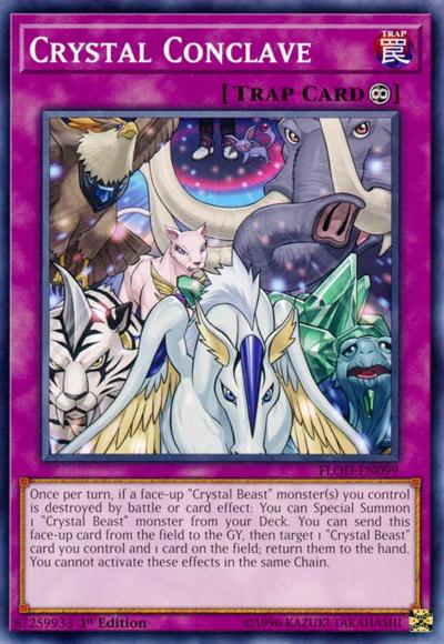 Once per turn, if a face-up ‘Crystal Beast’ monster(s) you control is destroyed by battle or card effect: You can Special Summon 1 ‘Crystal Beast’ monster from your Deck. You can send this face-up card from the field to the GY, then target 1 ‘Crystal Beast’ card you control and 1 card on the field; return them to the hand. You cannot activate these effects in the same Chain.