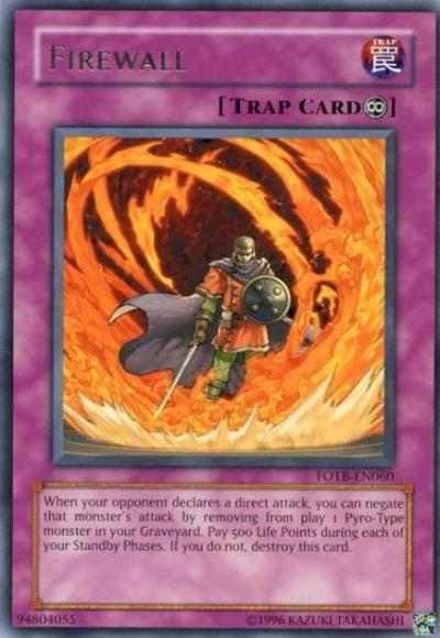 When your opponent declares a direct attack, you can negate that monster’s attack by removing from play 1 Pyro-Type monster in your Graveyard. Pay 500 Life Points during each of your Standby Phases. If you do not, destroy this card.