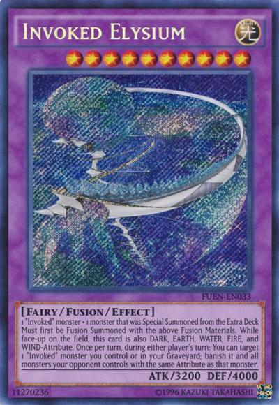 1 ‘Invoked’ monster + 1 monster that was Special Summoned from the Extra DeckMust first be Fusion Summoned with the above Fusion Materials. While face-up on the field, this card is also DARK, EARTH, WATER, FIRE, and WIND-Attribute. Once per turn, during either player’s turn: You can target 1 ‘Invoked’ monster you control or in your Graveyard; banish it and all monsters your opponent controls with the same Attribute as that monster.