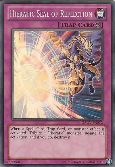 When a Spell Card, Trap Card, or monster effect is activated: Tribute 1 ‘Hieratic’ monster; negate the activation, and if you do, destroy it.