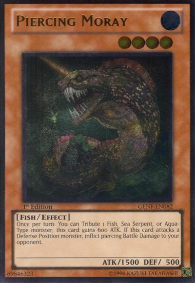 Once per turn: You can Tribute 1 Fish, Sea Serpent, or Aqua-Type monster; this card gains 600 ATK. If this card attacks a Defense Position monster, inflict piercing Battle Damage to your opponent.