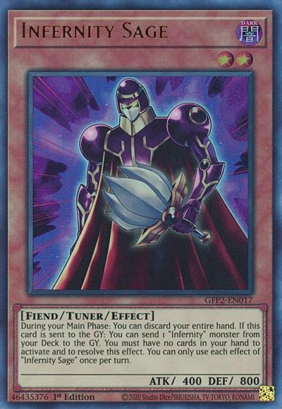 During your Main Phase: You can discard your entire hand. If this card is sent to the GY: You can send 1 ‘Infernity’ monster from your Deck to the GY. You must have no cards in your hand to activate and to resolve this effect. You can only use each effect of ‘Infernity Sage’ once per turn.
