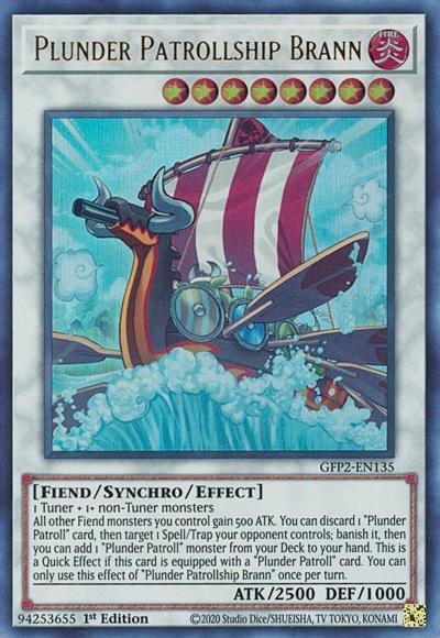 1 Tuner + 1+ non-Tuner monstersAll other Fiend monsters you control gain 500 ATK. You can discard 1 ‘Plunder Patroll’ card, then target 1 Spell/Trap your opponent controls; banish it, then you can add 1 ‘Plunder Patroll’ monster from your Deck to your hand. This is a Quick Effect if this card is equipped with a ‘Plunder Patroll’ card. You can only use this effect of ‘Plunder Patrollship Brann’ once per turn.