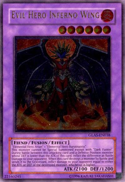 ‘Elemental HERO Avian’ + ‘Elemental HERO Burstinatrix’Must be Special Summoned with ‘Dark Fusion’ and cannot be Special Summoned by other ways. If this card attacks a Defense Position monster, inflict piercing Battle Damage to your opponent. When this card destroys a monster by battle and sends it to the Graveyard: Inflict damage to your opponent equal to either the ATK or DEF (whichever is higher) of the destroyed monster in the Graveyard.