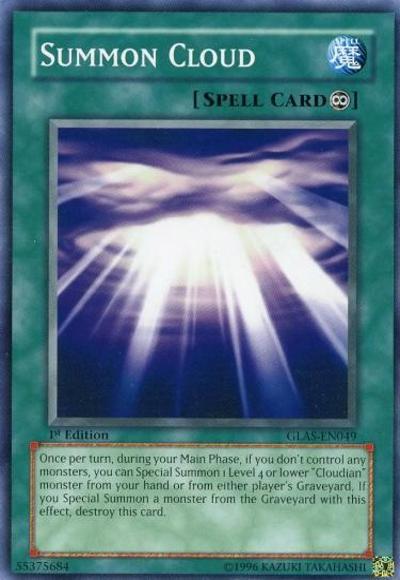 Once per turn, during your Main Phase, if you don’t control any monsters, you can Special Summon 1 Level 4 or lower ‘Cloudian’ monster from your hand or from either player’s Graveyard. If you Special Summon a monster from the Graveyard with this effect, destroy this card.