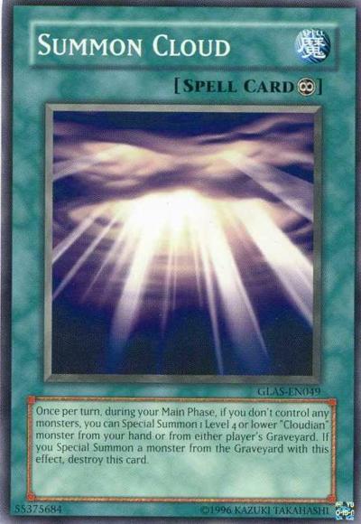 Once per turn, during your Main Phase, if you don’t control any monsters, you can Special Summon 1 Level 4 or lower ‘Cloudian’ monster from your hand or from either player’s Graveyard. If you Special Summon a monster from the Graveyard with this effect, destroy this card.