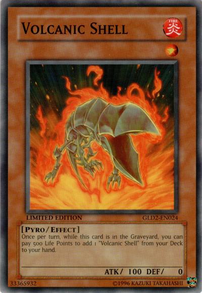 Once per turn: You can pay 500 LP; add 1 ‘Volcanic Shell’ from your Deck to your hand. This card must be in the GY to activate and to resolve this effect.