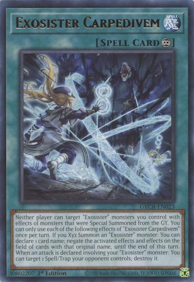 Neither player can target ‘Exosister’ monsters you control with effects of monsters that were Special Summoned from the GY. You can only use each of the following effects of ‘Exosister Carpedivem’ once per turn. If you Xyz Summon an ‘Exosister’ monster: You can declare 1 card name; negate the activated effects and effects on the field of cards with that original name, until the end of this turn. When an attack is declared involving your ‘Exosister’ monster: You can target 1 Spell/Trap your opponent controls; destroy it.