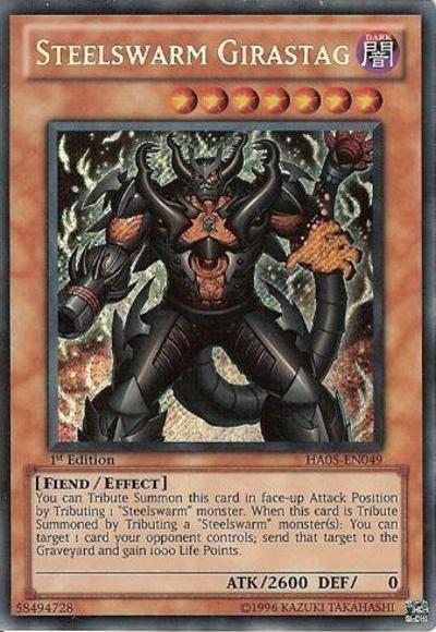 You can Tribute Summon this card in face-up Attack Position by Tributing 1 ‘Steelswarm’ monster. When this card is Tribute Summoned by Tributing a ‘Steelswarm’ monster(s): You can target 1 card your opponent controls; send that target to the Graveyard and gain 1000 Life Points.