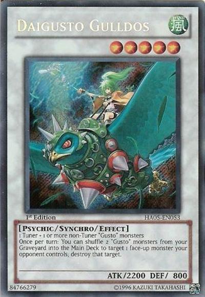 1 Tuner + 1 or more non-Tuner ‘Gusto’ monstersOnce per turn: You can shuffle 2 ‘Gusto’ monsters from your Graveyard into the Main Deck to target 1 face-up monster your opponent controls; destroy that target.