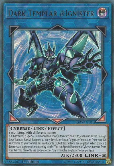 3 monsters with different namesIf a monster(s) is Special Summoned to a zone(s) this card points to, even during the Damage Step: You can Special Summon as many Level 4 or lower ‘@Ignister’ monsters from your GY as possible to your zone(s) this card points to, but their effects are negated. When this card destroys an opponent’s monster by battle: You can Special Summon 1 Cyberse monster from your GY. You can only use each effect of ‘Dark Templar @Ignister’ once per turn.