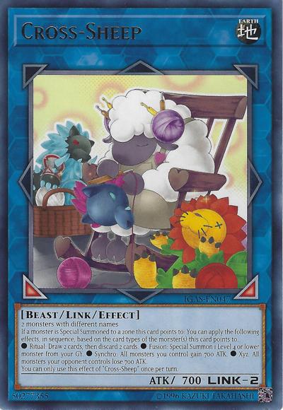 2 monsters with different namesIf a monster is Special Summoned to a zone this card points to: You can apply the following effects, in sequence, based on the card types of the monster(s) this card points to.● Ritual: Draw 2 cards, then discard 2 cards. ● Fusion: Special Summon 1 Level 4 or lower monster from your GY. ● Synchro: All monsters you control gain 700 ATK. ● Xyz: All monsters your opponent controls lose 700 ATK.You can only use this effect of ‘Cross-Sheep’ once per turn.