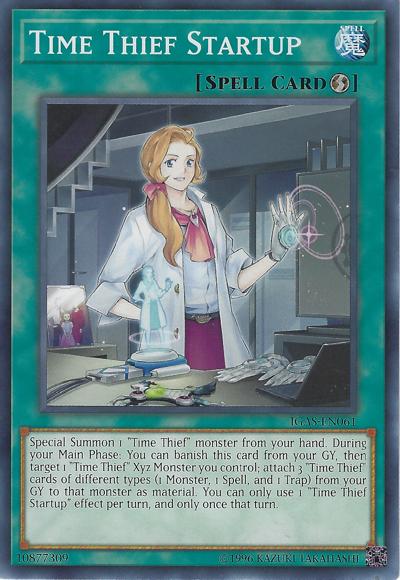 Special Summon 1 ‘Time Thief’ monster from your hand. During your Main Phase: You can banish this card from your GY, then target 1 ‘Time Thief’ Xyz Monster you control; attach 3 ‘Time Thief’ cards of different types (1 Monster, 1 Spell, and 1 Trap) from your GY to that monster as material. You can only use 1 ‘Time Thief Startup’ effect per turn, and only once that turn.