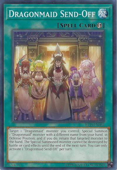 Target 1 ‘Dragonmaid’ monster you control; Special Summon 1 ‘Dragonmaid’ monster with a different name from your hand, in Defense Position, and if you do, return that targeted monster to the hand. The Special Summoned monster cannot be destroyed by battle or card effects until the end of the next turn. You can only activate 1 ‘Dragonmaid Send-Off’ per turn.