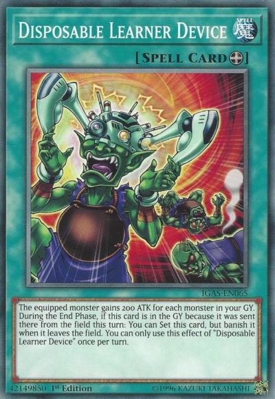 The equipped monster gains 200 ATK for each monster in your GY. During the End Phase, if this card is in the GY because it was sent there from the field this turn: You can Set this card, but banish it when it leaves the field. You can only use this effect of ‘Disposable Learner Device’ once per turn.