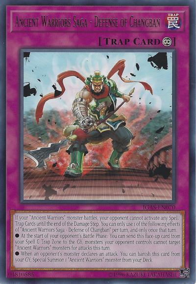 If your ‘Ancient Warriors’ monster battles, your opponent cannot activate any Spell/Trap Cards until the end of the Damage Step. You can only use 1 of the following effects of ‘Ancient Warriors Saga – Defense of Changban’ per turn, and only once that turn.● At the start of your opponent’s Battle Phase: You can send this face-up card from your Spell & Trap Zone to the GY; monsters your opponent controls cannot target ‘Ancient Warriors’ monsters for attacks this turn.● When an opponent’s monster declares an attack: You can banish this card from your GY; Special Summon 1 ‘Ancient Warriors’ monster from your Deck.