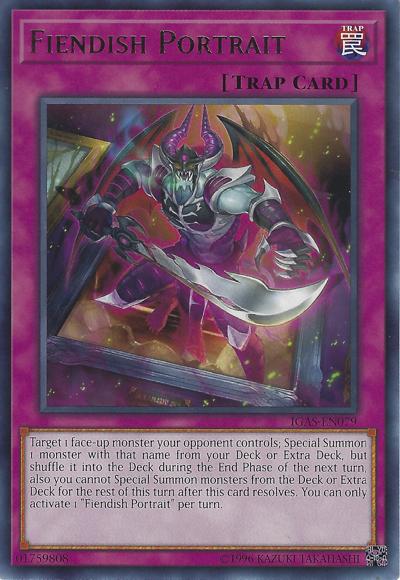 Target 1 face-up monster your opponent controls; Special Summon 1 monster with that name from your Deck or Extra Deck, but shuffle it into the Deck during the End Phase of the next turn, also you cannot Special Summon monsters from the Deck or Extra Deck for the rest of this turn after this card resolves. You can only activate 1 ‘Fiendish Portrait’ per turn.