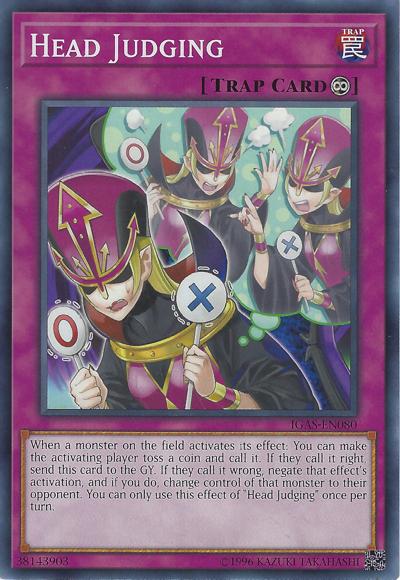 When a monster on the field activates its effect: You can make the activating player toss a coin and call it. If they call it right, send this card to the GY. If they call it wrong, negate that effect’s activation, and if you do, change control of that monster to their opponent. You can only use this effect of ‘Head Judging’ once per turn.