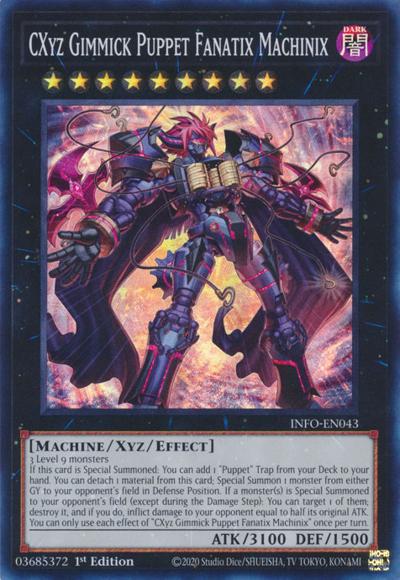 3 Level 9 monstersIf this card is Special Summoned: You can add 1 ‘Puppet’ Trap from your Deck to your hand. You can detach 1 material from this card; Special Summon 1 monster from either GY to your opponent’s field in Defense Position. If a monster(s) is Special Summoned to your opponent’s field (except during the Damage Step): You can target 1 of them; destroy it, and if you do, inflict damage to your opponent equal to half its original ATK. You can only use each effect of ‘CXyz Gimmick Puppet Fanatix Machinix’ once per turn.