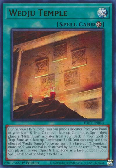 During your Main Phase: You can place 1 monster from your hand in your Spell & Trap Zone as a face-up Continuous Spell, then place 1 ‘Millennium’ monster from your Deck in your Spell & Trap Zone as a face-up Continuous Spell. You can only use this effect of ‘Wedju Temple’ once per turn. If a face-up ‘Millennium’ monster(s) you control is destroyed by battle or card effect, you can place it in your Spell & Trap Zone as a face-up Continuous Spell, instead of sending it to the GY.