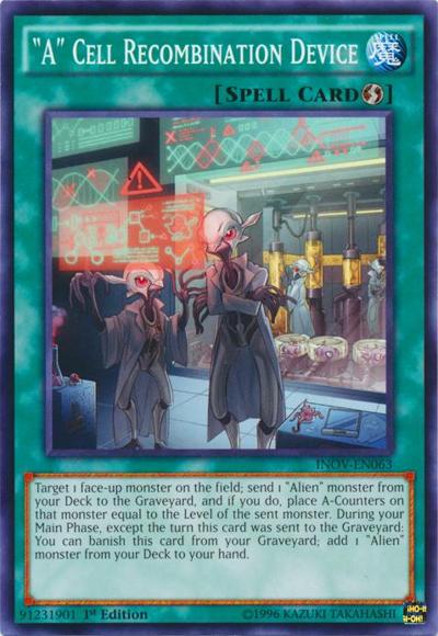 Target 1 face-up monster on the field; send 1 ‘Alien’ monster from your Deck to the Graveyard, and if you do, place A-Counters on that monster equal to the Level of the sent monster. During your Main Phase, except the turn this card was sent to the Graveyard: You can banish this card from your Graveyard; add 1 ‘Alien’ monster from your Deck to your hand.