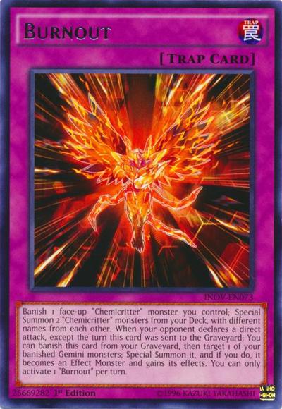 Banish 1 face-up ‘Chemicritter’ monster you control; Special Summon 2 ‘Chemicritter’ monsters from your Deck, with different names from each other. When your opponent declares a direct attack, except the turn this card was sent to the Graveyard: You can banish this card from your Graveyard, then target 1 of your banished Gemini monsters; Special Summon it, and if you do, it becomes an Effect Monster and gains its effects. You can only activate 1 ‘Burnout’ per turn.