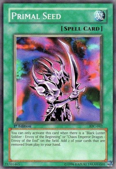 If ‘Black Luster Soldier – Envoy of the Beginning’ or ‘Chaos Emperor Dragon – Envoy of the End’ is on the field: Target 2 of your banished cards; add both those targets to your hand.