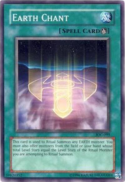 This card can be used to Ritual Summon any EARTH Ritual Monster. You must also Tribute monsters from your hand or field whose total Levels exactly equal the Level of the Ritual Monster you Ritual Summon.