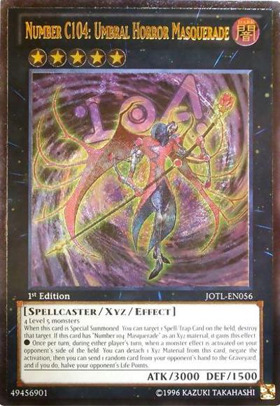 4 Level 5 monstersWhen this card is Special Summoned: You can target 1 Spell/Trap Card on the field; destroy that target. If this card has ‘Number 104: Masquerade’ as an Xyz material, it gains this effect.● Once per turn, during either player’s turn, when a monster effect is activated on your opponent’s side of the field: You can detach 1 Xyz Material from this card; negate the activation, then you can send 1 random card from your opponent’s hand to the Graveyard, and if you do, halve your opponent’s Life Points.