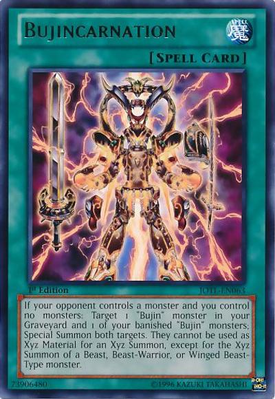 If your opponent controls a monster and you control no monsters: Target 1 ‘Bujin’ monster in your Graveyard and 1 of your banished ‘Bujin’ monsters; Special Summon both targets. They cannot be used as Xyz Material for an Xyz Summon, except for the Xyz Summon of a Beast, Beast-Warrior, or Winged Beast-Type monster.