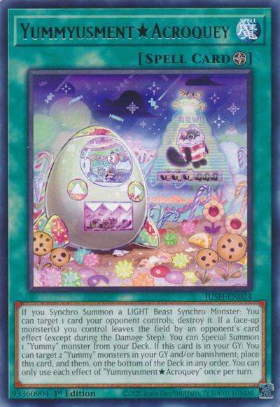 If you Synchro Summon a LIGHT Beast Synchro Monster: You can target 1 card your opponent controls; destroy it. If a face-up monster(s) you control leaves the field by an opponent’s card effect (except during the Damage Step): You can Special Summon 1 ‘Yummy’ monster from your Deck. If this card is in your GY: You can target 2 ‘Yummy’ monsters in your GY and/or banishment; place this card, and them, on the bottom of the Deck in any order. You can only use each effect of ‘Yummyusment★Acroquey’ once per turn.