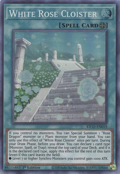 If you control no monsters: You can Special Summon 1 ‘Rose Dragon’ monster or 1 Plant monster from your hand. You can only use this effect of ‘White Rose Cloister’ once per turn. During your Draw Phase, before you draw: You can declare 1 card type (Monster, Spell, or Trap); reveal the top card of your Deck, and if it is the declared card type, apply this effect for the rest of this turn (even if this card leaves the field).● Level 7 or higher Synchro Monsters you control gain 1000 ATK.