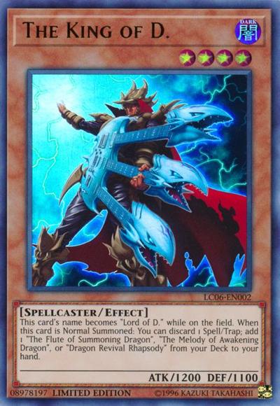 This card’s name becomes ‘Lord of D.’ while on the field. When this card is Normal Summoned: You can discard 1 Spell/Trap; add 1 ‘The Flute of Summoning Dragon’, ‘The Melody of Awakening Dragon’, or ‘Dragon Revival Rhapsody’ from your Deck to your hand.