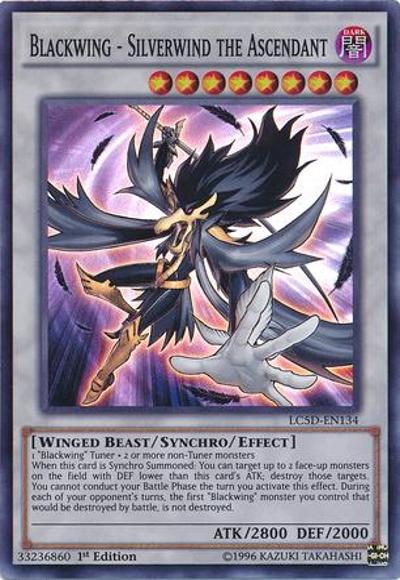 1 ‘Blackwing’ Tuner + 2 or more non-Tuner monstersWhen this card is Synchro Summoned: You can target up to 2 face-up monsters on the field with DEF lower than this card’s ATK; destroy those targets. You cannot conduct your Battle Phase the turn you activate this effect. During each of your opponent’s turns, the first ‘Blackwing’ monster you control that would be destroyed by battle, is not destroyed.