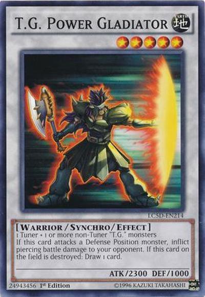 1 Tuner + 1 or more non-Tuner ‘T.G.’ monstersIf this card attacks a Defense Position monster, inflict piercing battle damage to your opponent. If this card on the field is destroyed: Draw 1 card.