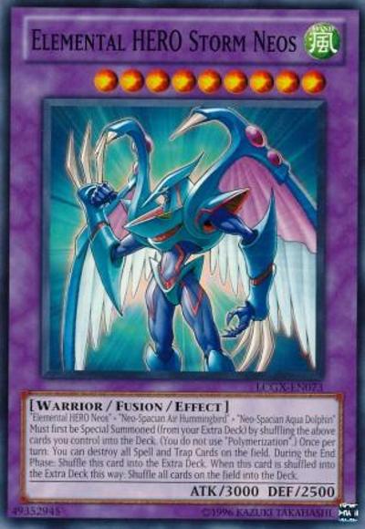 ‘Elemental HERO Neos’ + ‘Neo-Spacian Air Hummingbird’ + ‘Neo-Spacian Aqua Dolphin’Must first be Special Summoned (from your Extra Deck) by shuffling the above cards you control into the Deck. (You do not use ‘Polymerization’.) Once per turn: You can destroy all Spell and Trap Cards on the field. During the End Phase: Shuffle this card into the Extra Deck. When this card is shuffled into the Extra Deck this way: Shuffle all cards on the field into the Deck.
