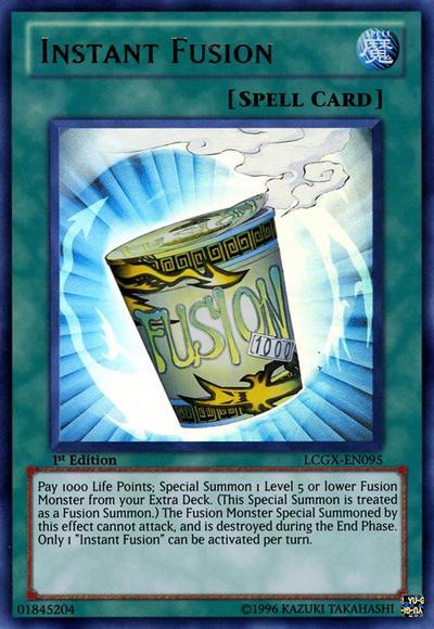 Pay 1000 LP; Special Summon 1 Level 5 or lower Fusion Monster from your Extra Deck, but it cannot attack, also it is destroyed during the End Phase. (This is treated as a Fusion Summon.) You can only activate 1 ‘Instant Fusion’ per turn.