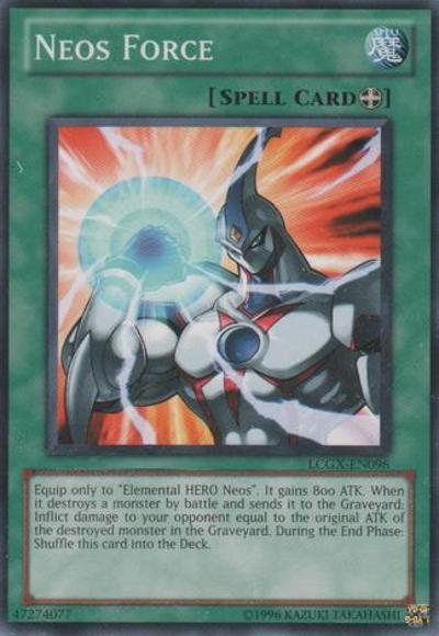 Equip only to ‘Elemental HERO Neos’. It gains 800 ATK. When it destroys a monster by battle and sends it to the Graveyard: Inflict damage to your opponent equal to the original ATK of the destroyed monster in the Graveyard. During the End Phase: Shuffle this card into the Deck.