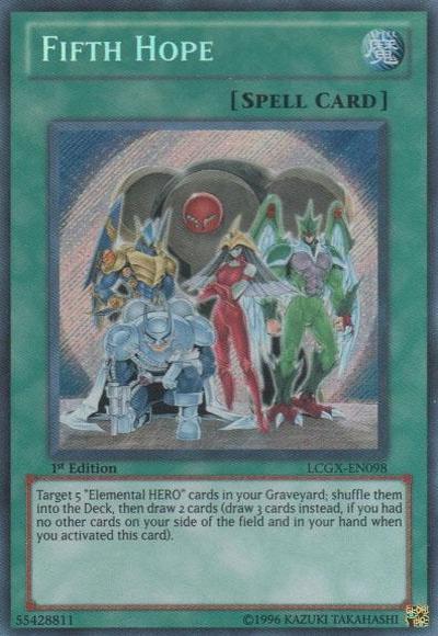 Target 5 ‘Elemental HERO’ cards in your Graveyard; shuffle them into the Deck, then draw 2 cards (draw 3 cards instead, if you had no other cards on your side of the field and in your hand when you activated this card).